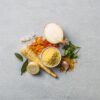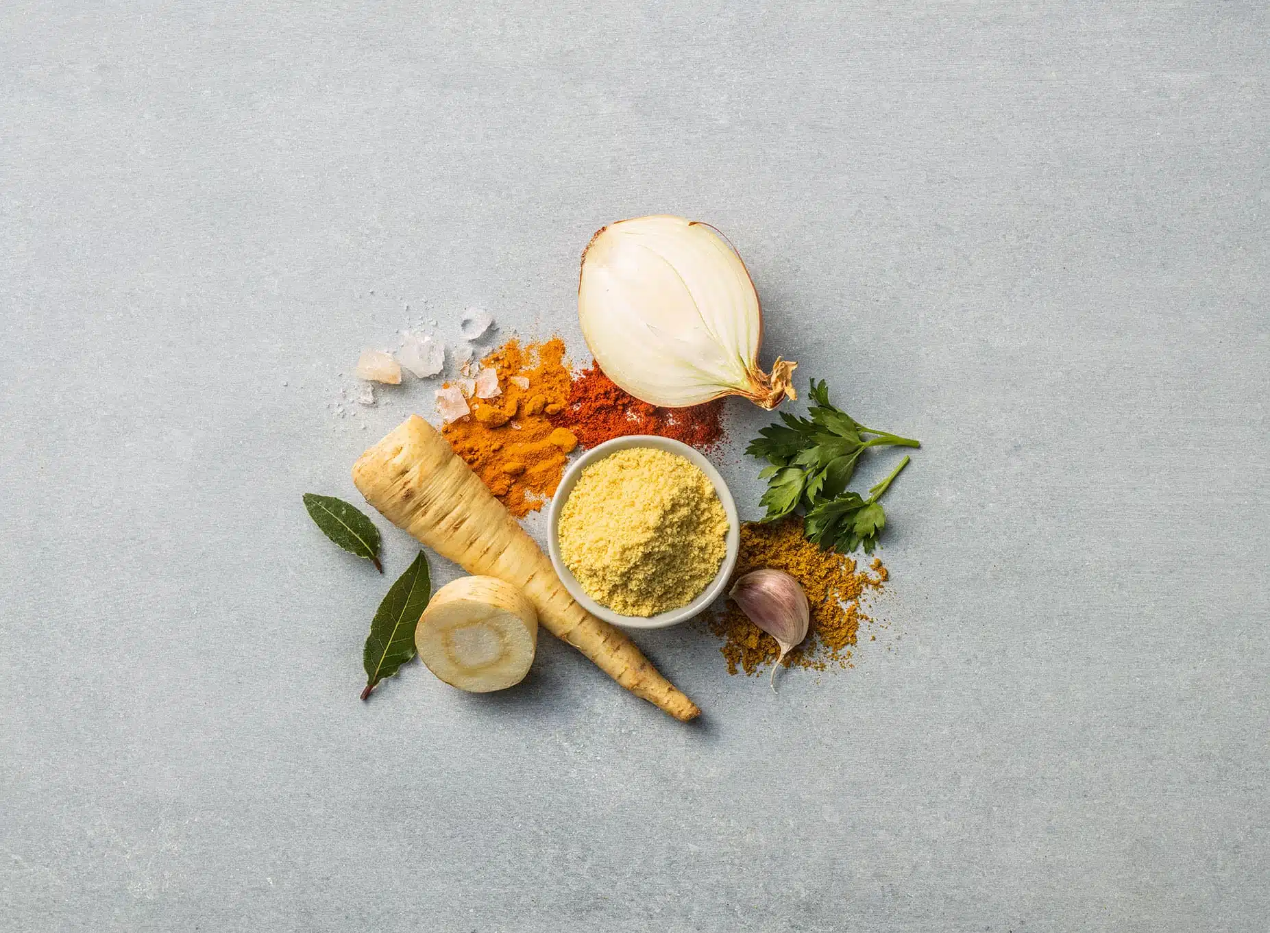 Состав: горная соль от Bex (CH), рисовая мука, растворимая кукурузная клетчатка, корни петрушки, рапсовое масло, лук, натуральные приправы, чеснок, волокна лимона, куркума, лавровый лист.