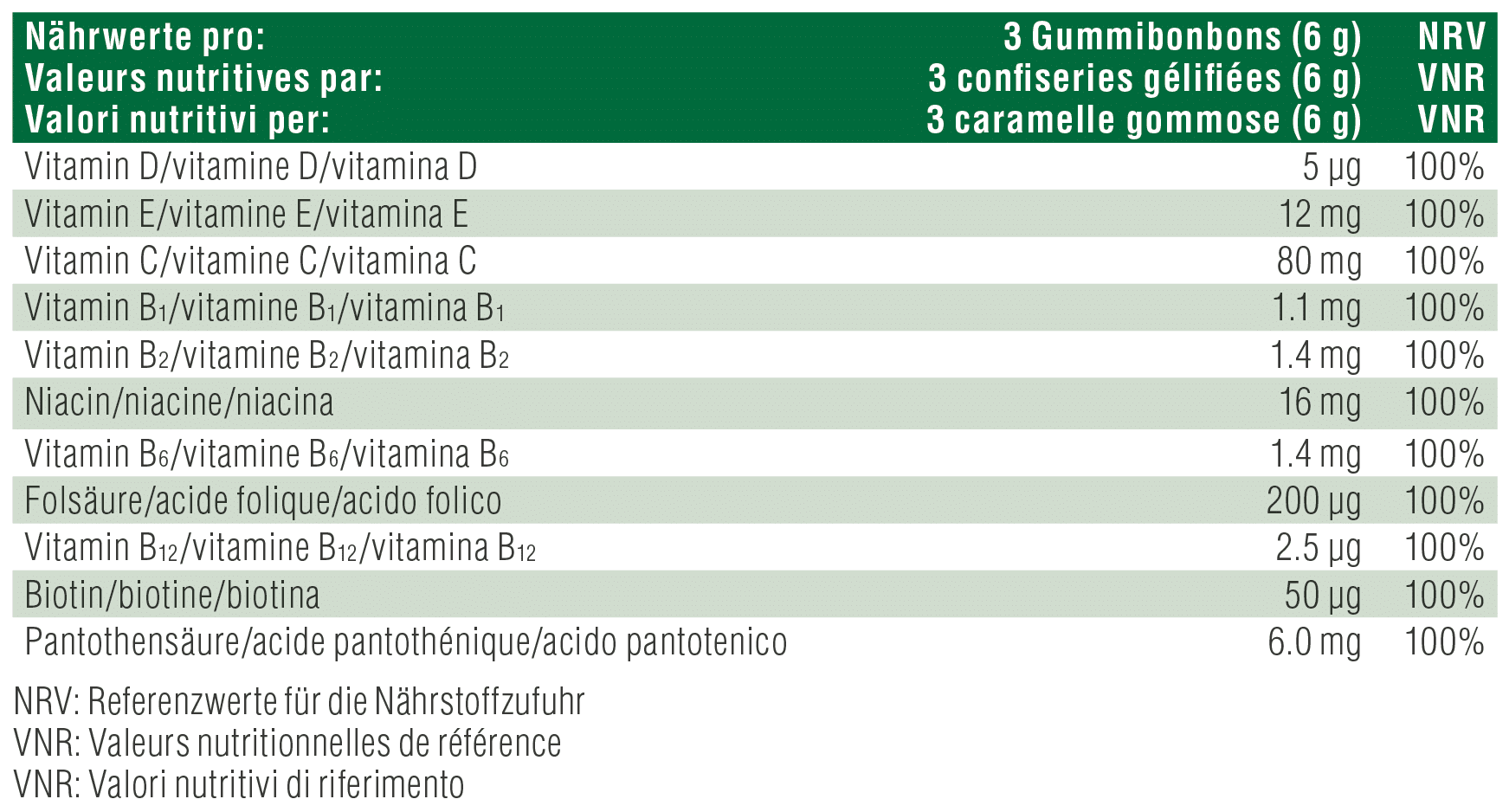 Magusained: maltitool ja sorbitoolisiirup, želatiin, vitamiinid (retinüülatsetaat (vit. A), L-askorbiinhape (vit. C), kolekaltsiferool (vit. D3), DL-alfa-tokoferüülatsetaat (vit. E), tiamiinvesinikkloriid (vitamiin B1), riboflaviin (vitamiin B2), püridoksiinvesinikkloriid (vitamiin B6), tsüanokobalamiin (vitamiin B12), D-biotiin, pteroüülglutamiinhape (foolhape), nikotiinamiid (niatsiin), D-pantotenaatkaltsium (pantoteenhape)), hapendaja: sidrunhape, lõhna- ja maitseained, värvaine: beetakaroteen, katteaine: karnaubavaha.